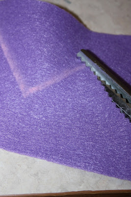 Once we had it right, Kaia picked out what colours of felt she wanted and I traced the paper pattern onto felt using chalk. I would have preferred fabric chalk, but sidewalk chalk was what was within reach. ;) I cut a straight edge on the brown felt for the backing. Then I cut the purple felt a little bit smaller, and used pinking shears along the top edge.