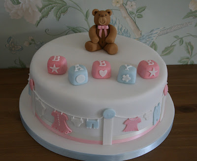 The recipient didn't know if she was having a girl or a boy, so I went for both pink and blue which adds a bit of interest to the cake. It was really simple to make using the cutters and the washing line is just a line of piped royal icing. To make the clothes look slightly more realistic I also piped on buttons and used the end of a piping nozzle to cut in some details.
